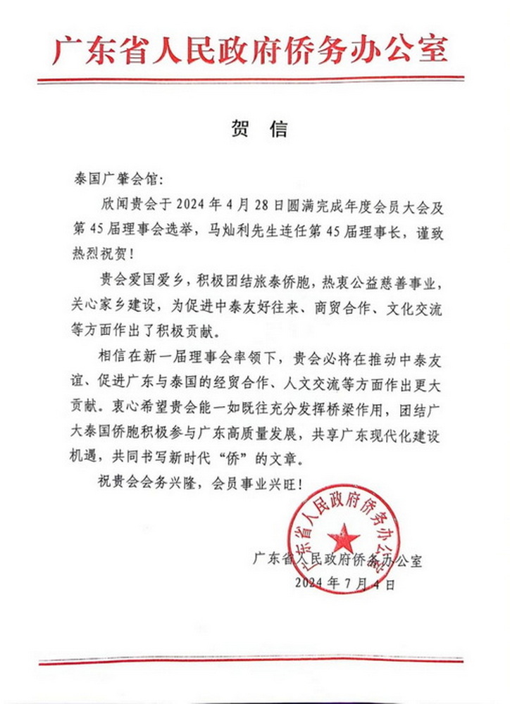 泰國廣肇會館第四十五屆就職典禮,擇吉於2024年6月27日星期四上午,假座中華總商會九樓光華堂隆重舉行,歷任三十七、三十八屆及四十四屆理事長馬燦利鄉賢,熱心會務,致力會務蓬勃發展,獲眾擁護蟬聯第四十五屆理事長。副總理兼内政部長陳錫堯,中國駐泰國特命全權大使韓志強,公參兼總領事潘瑾,中華總商會主席林楚欽博士,泰國總商會主席洪百川博士,泰國潮州會館永遠名譽主席李光隆,泰國潮州會館徐惠深主席,前能源部長那隆猜博士,該會顧問團主席兼永遠名譽理事長何國雄博士,香港駐曼谷經貿周展程代處長,華僑報德善堂代董事長徐光輝,僑團首長陳錫源、劉秉青、歐先梓、郭光國、吳好如、蕭鴻洽,各屬首長盧平光,符祥笈、林立盛、張德仁、邱燁、王載麟、劉德明、張振傳等。該會全國各地鄉親,轄下醫院、學校、八和會館、粵曲同樂會代表逾300人出席見證新屆理事會成立。
