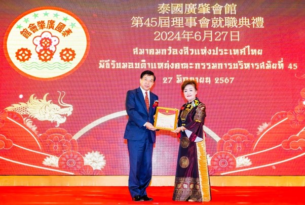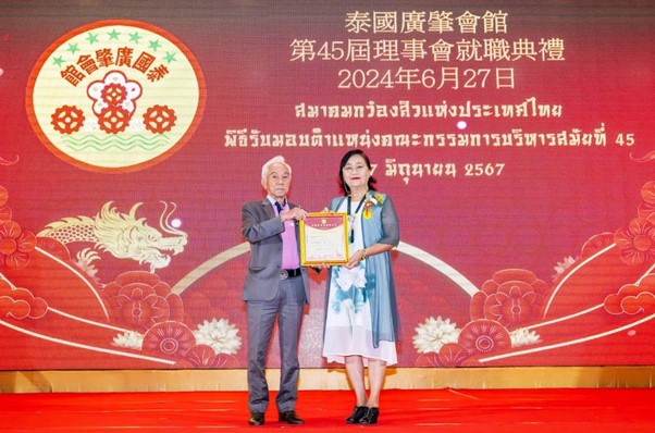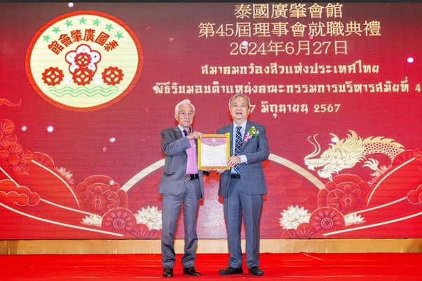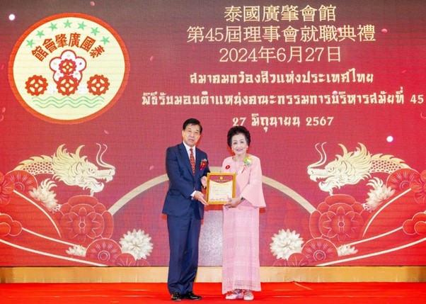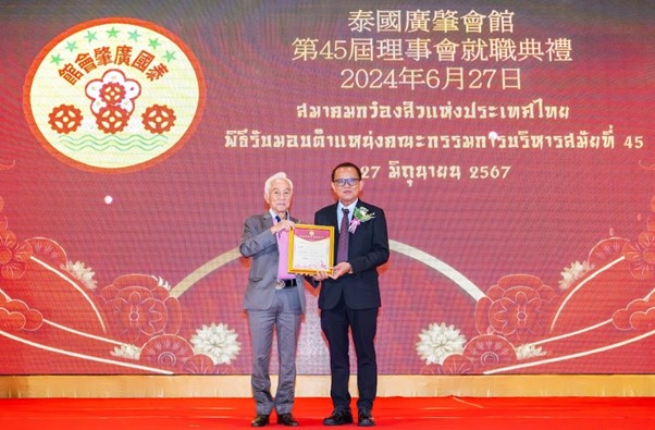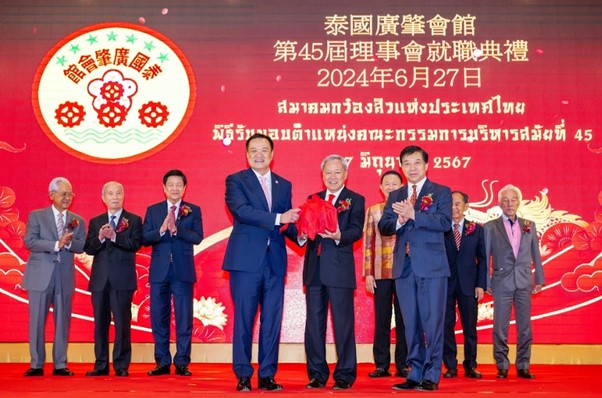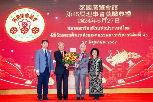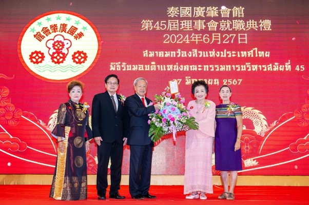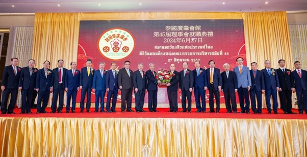 พิธีรับมอบตำแหน่งคณะกรรมการบริหารสมัยที่ 45 ได้รับเกียรติจาก ฯพณฯอนุทิน ชาญวีรกูล รองนายกรัฐมนตรีและรัฐมนตรีว่าการกระทรวงมหาดไทย , ฯพณฯหานจื้อเฉียง เอกอัครราชทูตสาธารณรัฐประชาชนจีนประจำประเทศไทย , ฯพณฯพานจิ่น กงสุลใหญ่ประจำสาธารณรัฐประชาชนจีนประจำประเทศไทย , คุณณรงค์ศักดิ์ พุทธพรมงคล ประธานหอการค้าไทย-จีน , คุณสนั่น อังอุบลกุล ประธานสภาหอการค้าแห่งประเทศไทย , คุณวิสิทธิ์ ลีละศิธร ประธานกิตติมศักดิ์ตลอดชีพสมาคมแต้จิ๋วแห่งประเทศไทย , คุณชิม ชินวิริยกุล ประธานสมาคมแต้จิ๋วแห่งประเทศไทย, ดร.ณรงค์ชัย อัครเศรณี อดีตรัฐมนตรีว่าการกระทรวงพลังงาน , Mr.Jason Chow ตัวแทนผู้อำนวยการสำนักงานเศรษฐกิจและการค้าฮ่องกงประจำกรุงเทพฯ , คุณวิชิต ชินวงศ์วรกุล รองประธานกรรมการมูลนิธิป่อเต๊กตึ๊ง, ดร.อุดม ชัยชนะพานิช นายกสมาคมฮากกาแห่งประเทศไทย, คุณมานะผล ภู่สมบุญ นายกสมาคมใหหนำแห่งประเทศไทย , คุณหลินลี่เซิ่ง ตัวแทนนายกสมาคมฮกเกี้ยนแห่งประเทศไทย, คุณจางเต๋อเยริ๋น นายกสมาคมเจียงเจ้อเซี่ยงไฮ้แห่งประเทศไทย, คุณหวังจายหลิน ตัวแทนประธานสมาคมไต้หวันแห่งประเทศไทย, คุณหลิวเต๋อหมิง นายกสมาคมหยูนหนาน(ประเทศไทย) , คุณจางเจิ้นฉวน ประธานสมาคมกวางสี(ประเทศไทย) , 14 องค์กรของสมาคมกว๋องสิวทั่วประเทศไทย , คณะครูและนักเรียนของโรงเรียนกว่างเจ้า , สมาคมปาหว่ออุปรากรจีนแห่งประเทศไทย, ชมรมเพลงอุปรากรจีนกวางตุ้ง และแขกผู้มีเกียรติจำนวนกว่า 300 ท่าน ร่วมเป็นสักขีพยานของพิธีดังกล่าว